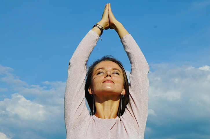 Со вдохом поднимите руки вверх через стороны и соедините ладони. Взгляд направьте вверх.