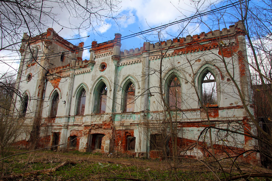 Чтобы познакомится со следующим замком, нам потребуется перенестись в Калужскую область. Когда-то здешний замок практически ничем не уступал роскошному замку в Муромцево. Здание отапливалось калориферной системой отопления. Замок со всех сторон окружался огромными деревьями и каскадными прудами. Особенно стоит выделить мельницу, пасеку и рыбные пруды.